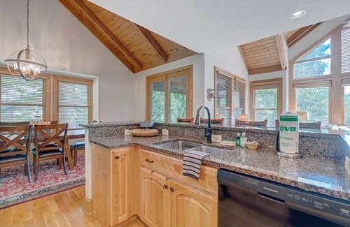 The main level welcomes you with a well-appointed kitchen, inviting living and dining areas, a primary suite with bathroom, guest bedroom and bathroom, and a generously sized deck. The upscale kitchen boasts stainless appliances, granite countertops, and seating for four at the kitchen bar area. Guests can relax in the living room, offering ample seating to enjoy the cozy gas logs, watch television, or indulge in a good book. The primary suite features a king-size bed, standalone shower, double vanity, large closet, and access to the main floor deck. The adjacent guest bedroom on the main floor features a queen-size bed and an adjoining full bathroom.