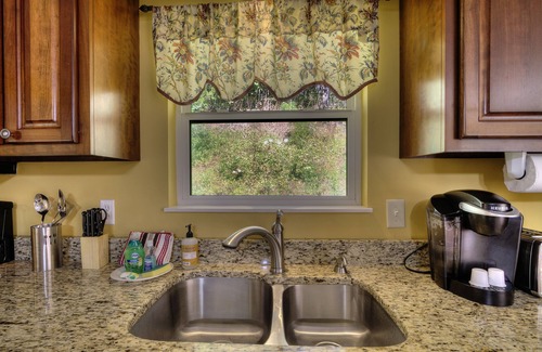 And there is a little kids bedroom with a bunk bed. The living room has a futon bed, 2 armchairs and LED TV. There is a laundry room with a washer and dryer between the living room and kitchen and the opposite from the laundry room is the half bath. The well-appointed chef's kitchen is equipped with all the appliances as Keurig coffee machine, toaster, refrigerator, microwave and the dining area with a rustic table.