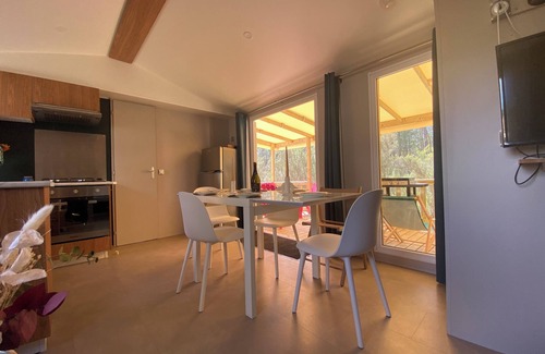 Air-conditioned accommodations at Claouey, "les Embruns" Cap Ferret, MH premium 6/8 pers, air-conditioned, water park offer coffee/tea makers. Rooms open to patios. Kitchens offer refrigerators, stovetops, microwaves, and cookware/dishes/utensils. Bathrooms include showers.