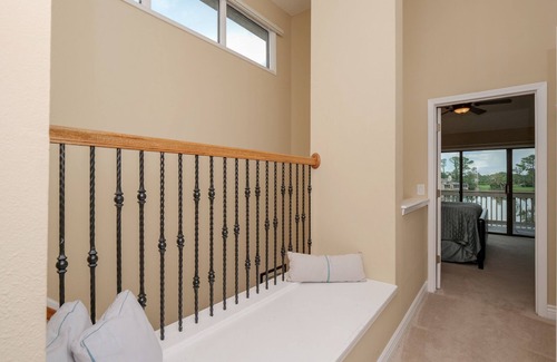 The primary bedroom is upstairs with a king bed overlooking the lake. The bathroom has double sinks, separate tub and shower, and a walk-in closet. The third bedroom, also located upstairs, has two twin beds, en-suite bathroom and a walk-in closet.