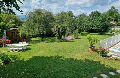 Lovely furnished City Break accommodation near the city of Lyon, South side, easily accessed from A7 motorway. It is located in residential area, on 1st floor of house adjoining that of the owners. Separate access. Ground floor : owners' laundry room (washing machine & tumble drier can be made available on request). 1st floor : light and airy living room (lounge area with bed settee available to provide separate sleeping arrangements), (dining area with wood pellet stove), (kitchen area with high quality equipments & direct access to garden via outside stairs). WC. Hall leading to 3 bedrooms, each one with en-suite shower room/WC, desk & WIFI Internet access : (double bed), (2 single beds), (double bed). Outdoors : shared garden (lawn) with swimming pool (treatment with salt) available in summer on set times. Free parking in the street. Accommodation can be booked on a nightly basis (with or without breakfast).