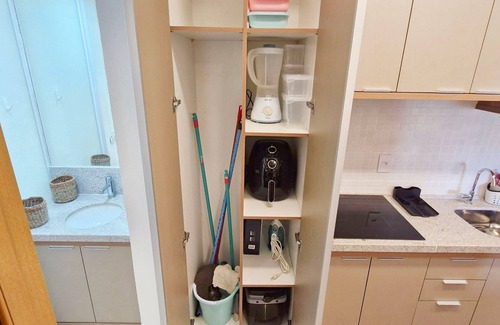 - Countertop with 4 chairs, double-door refrigerator, 4-burner induction cooktop, water filter, air fryer, microwave, sandwich maker, blender, coffee maker, pots, pans, cutlery, dishes, and kitchen essentials. Iron and cooler.