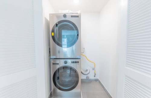 Each bathroom is equipped with modern fixtures, a bathtub and shower combo, and essential amenities like hair dryers. The home's thoughtful features like air conditioning, heating, high-speed WiFi, washer and dryer for free, and iron ensure you have all the comforts of home, and more.