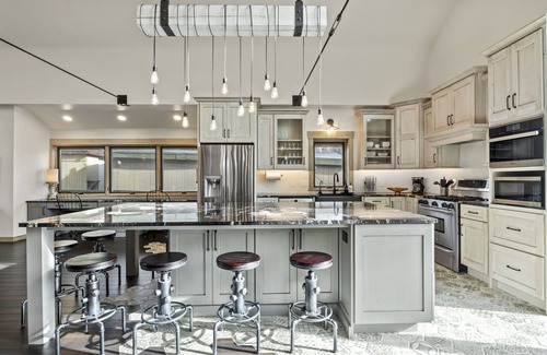 Gourmet kitchen will make cooking at home a pleasurable experience. You won't find a better equipped kitchen in Colorado Springs! Gas 36" range, Miele steam oven, expansive spices, service ware, and tools needed for any meal. MASSIVE Brazilian titanium granite slab island with barstool seating for 7. Industrial table with seating for 8. 9' custom bifold door will lead to the BBQ and deck with rocking chairs. Open the door and bring the outside in!