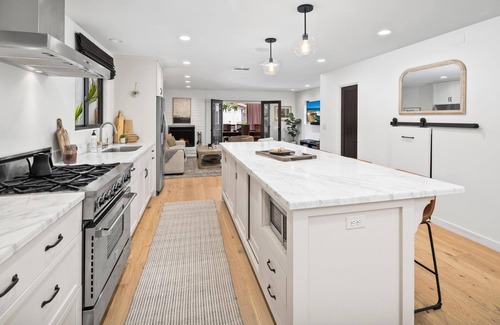 This contemporary Mediterranean home is less than 3 blocks from the famous Hotel del Coronado and beach, and steps from Orange Ave restaurants and shops. This ideal, 2-story vacation beach house has three upstairs bedrooms - two master suites with balconies and a third bedroom with its own bathroom - and a wide open floor plan on the ground level with modern chef’s kitchen and 10-foot marble island. Enjoy seamless indoor/outdoor living and entertaining. French doors open onto a front porch with beautiful, modern seating for a sunny morning coffee or a cocktail in the evening. Another set of French doors open to the backyard and an outdoor dining room w/ teak table that seats up to 12. The backyard includes lounge seating, a hammock for afternoon naps and reading, and an outdoor hot water shower. Plug into the indoor and outdoor Sonos system to play your favorite beach tunes. House comes with 2 beach cruiser bicycles, surfboards, boogie board, beach chairs and umbrella.