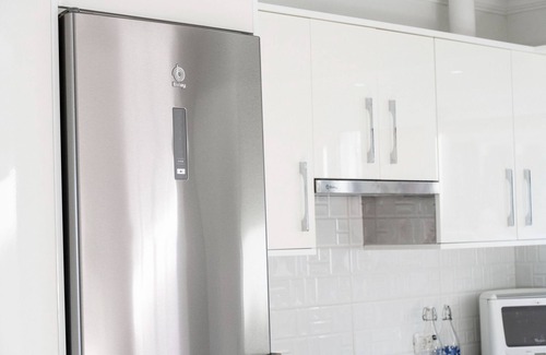 The kitchen is equipped with refrigerator, oven, freezer, washing machine, dishes/cutlery, kitchen utensils.