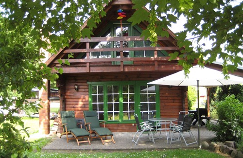 Comfortable privately used log cabin Bauj 2002 in a quiet central location. Spacious 70sqm living space. 1 living room, 2 bedrooms (1xDoppelbett, 2xSinzelbett) upstairs, 1 kitchen, 1 bathroom shower / WC. Living room with direct access to the garden. Large covered porch with rustic seating. Sun porch. Wood-burning stove. Well maintained Alleinground about 600 sqm. Fully fenced. Ideal for dog lovers. 2 car parking spaces.