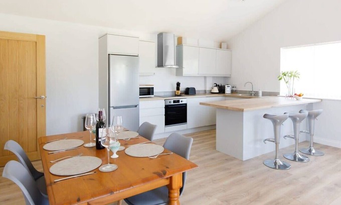 The home has a stylish fully-equipped kitchen with all the modern appliances you need for preparing meals and picnics. The countertops are spacious and there is a breakfast bar with three comfy stools. Perfect for a morning coffee or evening drink. As well as pots, pans, crockery and glassware, you also have the following...