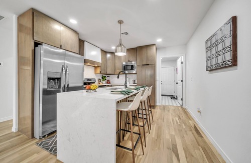 The space has been completely redesigned. Its seamless transition from living room to kitchen welcomes you with new amenities which include all new furnishings, floors and walls. In the kitchen you will find all stainless steel appliances, granite countertops with a full size farm sink and everything else needed to make this kitchen fully equipped for you and your guests to enjoy. Stunning countertops that provide ample workspace and a kitchen island with additional seating. There are 3 beds total in this space, one king in the master and two full beds in the secondary bedroom. Bathrooms are done tastefully with luxurious green tile and state of the art fixtures offering shampoo, conditioner and body wash. Terrific overhead lighting will leave you feeling refreshed and beautiful in front of the deluxe mirrors. A Samsung full sized washer and dryer free to use for all your laundry needs. Enjoy brand new Samsung Smart TV's in each room offering. No stone was unturned when completing this complete renovation, come stay and see all the beauty Tulsa has to offer!