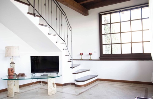The home has a ground floor with living room with a sofa bed and kitchen, while at the first floor you will find the big bedroom with the queen size bed, a bathroom with shower and a studio with an ancient wooden desk. Wifi is also provided, for free.