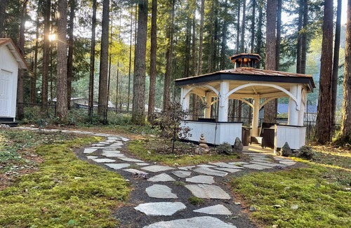 Along with the entire home to yourself, you can enjoy a beautiful yard space with a propane fire pit, cushioned outdoor seating, and a gazebo to spend time in during any season.