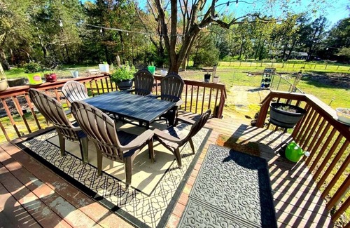 Take it easy at this unique and tranquil country feel getaway just 15 minutes from downtown Raleigh. Enjoy a nice meal on the back deck or a firepit surrounded by trees. Appreciate the Wildlife running & flying around the big maple tree. Our home is off a main road therefore there will be some vehicle noise, but we added smart speakers in each bedroom to help light sleepers. Comfortable desk and chair to work from home. Walnut Creek Music Park 5 minutes and DT Raleigh 15 minutes away