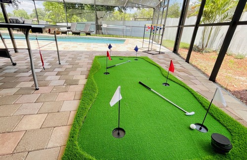 The screened backyard oasis is a great entertainment space for family and friends to enjoy the saltwater and heated swimming pool, or challenge in a ping pong tournament. It also has a small golf putter green space by the pool. Afterwards, enjoy the BBQ with the gas grill and lounge on the poolside chairs under the warm Florida sun. Enjoy the beautiful sunset by the lake while your family gather by the fire pit at night.