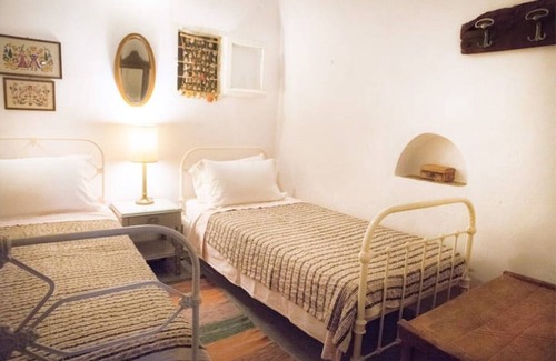This is an old house, build of stone with timber beam ceilings. It is peaceful, the loudest noises tend to be goats on the hillside or our cockerels. The Farmhouse sleeps 7 over 4 bedrooms and a bed in a through room (see photo of bed with yellow wall behind) can bring the total up to 8 if you want. Three of the bedrooms lead off the large living room together with a bathroom and the fourth bedroom is just below the house.