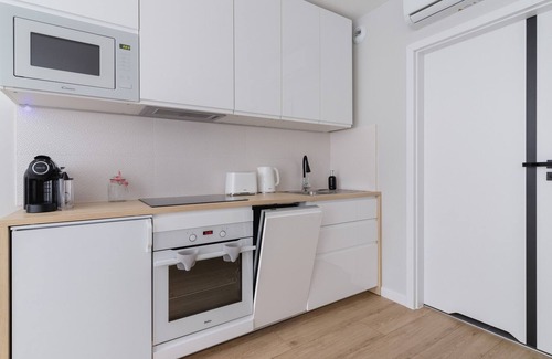 This modern and fully-equipped studio apartment can accommodate 2 people. Perfect for couples or a solo trip! It consists of a living room with a kitchenette, and a bathroom with a shower. The combination of modern décor with a contrasting and minimalist color palette seamlessly introduces hospitable and comfortable character of the place. Big windows fill the space with natural sunlight. The studio is equipped with a desk and a chair, making it a perfect place for remote work. A big advantage of the accommodation is air conditioning – especially useful on hot summer days. The kitchenette offers all the necessary appliances for self-catering, such as an induction hob, an oven, and a microwave. Some additional equipment to ensure your highest comfort includes a toaster, a coffee machine, and a dishwasher. Guests also have access to a Smart TV with cable television, and a free Wi-Fi network, as well as all the essential bathroom equipment (a washing machine, a hair dryer). The accommodation is a perfect choice for anyone who values comfort and functionality, but also the aesthetics. For an easy beginning of every stay, complimentary cosmetics set, towels, and bed linen are provided.