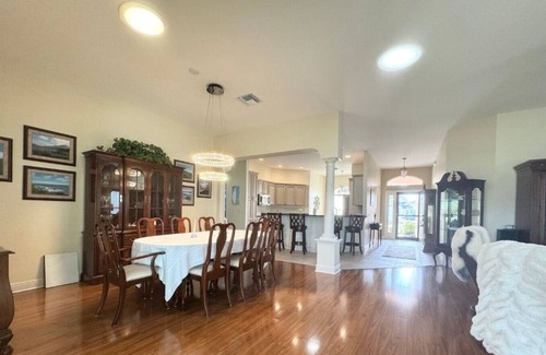 The home is perfect for gatherings, with plenty of seating areas both inside and out, including a gas BBQ grill for outdoor dining. The enclosed lanai, as well as the quiet sitting area in the backyard with two comfortable chairs, provide peaceful spots to unwind. Additionally, the home is equipped with board games to enhance your entertainment.