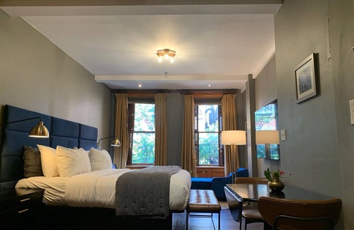 This spacious and well appointed 350 square foot Deluxe King Room was designed around the original wood moldings, doors and light fixtures. It features high ceilings with views of historic Orchard Street, as well as modern conveniences and sumptuous bedding added in. Walls are adorned with black-and-white photographs from the 1930s, by famed photographer Rebecca Lepkoff.