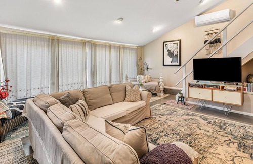 Uniquely divided into two separate living areas with loft sleeping spaces, the light and bright 1,350-square-foot guest house features autographed music records and posters paired with a relaxed, Malibu boho-chic vibe. One side includes an inviting sofa bed, a retro kitchenette with a full-size vintage fridge/freezer, a coffee maker, a microwave, a toaster oven, a dining table, and a loft with a comfortable bed and a smart TV. The other side boasts comfortable sofas, a wall air-conditioning unit, a smart TV with streaming services, and a loft sleeping space detailed with well-appointed beds and trundles.