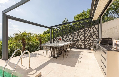 Design holiday home Croatia. Fantastic panoramic location in the mountains with sea view. Pleasant climate due to mountain location. Fully air-conditioned. Heated outdoor pool and hot spring whirlpool. Beautiful garden with palm trees. Very quiet location. Ultra fast internet. Shopping facilities at 3000 metres.