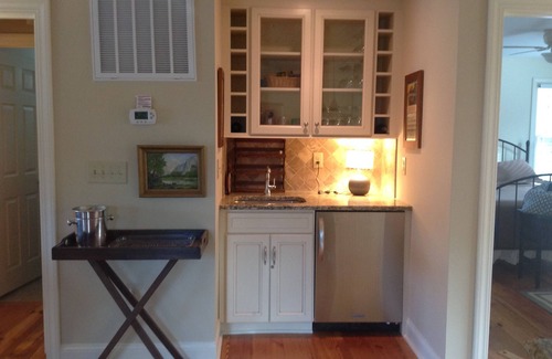 The dining area provides a table for 10, and opens onto an upstairs deck that provides space to chat, play cards, or enjoy the view. The entire upstairs (main level) offers antique heart pine floors. Easy-to-navigate interior staircase takes you downstairs. Both levels are centrally heated and cooled.