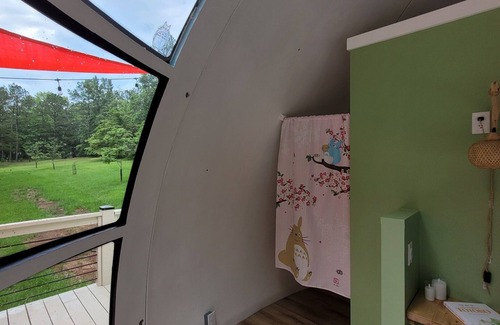 Cozy Comfort Meets Natural Wonder - Unique Design: The hard-sided geodome blends eco-conscious architecture with breathtaking forest views, its floor-to-ceiling windows framing nature’s beauty like a living painting. This is not a canvas tent geodome. Inside, find a cozy retreat with a full bathroom (including a shower and standard toilet), and kitchenette with an in-sink dishwasher, and a super comfy king size bed, as well as a mini-split to keep the interior comfortable year round. It has everything you need for a hassle-free stay. Thoughtful, hand-crafted touches inspired by “My Neighbor Totoro” add a whisper of whimsy without overpowering the natural charm.