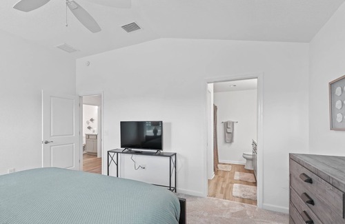 The master bedroom is a spacious retreat with a king-size bed and a Smart TV, while the master bathroom pampers you with double sinks and a walk-in shower. The guest bedroom is comfortable and features a queen-size bed, a dedicated workspace, and a TV. The guest bathroom offers a tub/shower combo and is conveniently located near the guest bedroom. To enjoy the Florida weather with friends and family, there's an additional seating area on the back patio.