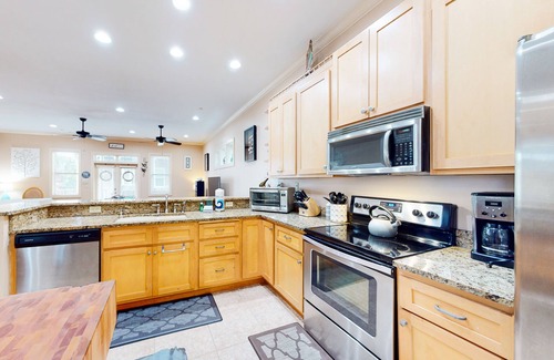 At home, start each day with a quiet cup of coffee on either of two private, comfortably furnished balconies, then step inside to the full, well-equipped kitchen to whip up some breakfast. Cooking for the crew is a breeze, with a full suite of stainless steel appliances, lots of counter space, and a separate kitchenette on the ground floor featuring another oven and a mini-fridge. Grab a bite at the breakfast bar; sit down for a full meal at the dining table; or dine alfresco on the balcony. Pop the dishes in the dishwasher for easy cleanup, then slip into your swimsuit and head to the community pool to soak up some Florida sunshine close to home. If you feel like some exercise, hop on one of the four bikes available for your use and explore on two wheels.