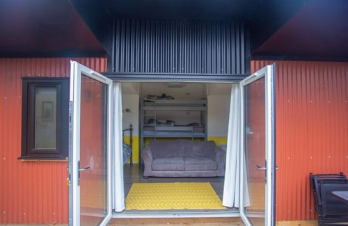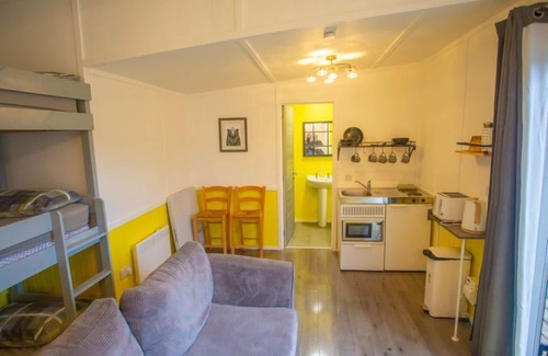"Dougie's", 1-room chalet on the ground floor. Object suitable for 2 adults + 3 children. Comfortable and modern furnishings: open living/dining room with 1 x 3 bunk beds, 1 double bed, dining table, shower/WC and TV (flat screen). Exit to the veranda. Kitchenette (2 hot plates, kettle, microwave). Small patio. Terrace furniture. Beautiful view of the river. Parking. Please note: suitable for families. Fridge without freezer, non-smoking house. TV only EN. Smoke alarm.