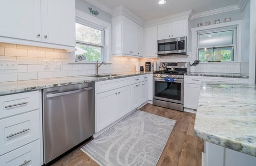 DOWN TIME was made to be comfortable for both you and dogs! Every bedroom and the living room include Smart TVs with blazing fast fiber optic internet and include Netflix, Amazon Prime, HBO Max, and Hulu (including live programing for news and sports). All of the furniture in the home is new and ready for you and your dogs to enjoy. The kitchen is fully stocked with dishes, cooking utensils, gas range, microwave, pots, pans, coffee pot, crockpots, toaster, air-fryer, and much more. Your family and friends can enjoy meals at the kitchen island, the dining room table or even on the six-seat table in the backyard.