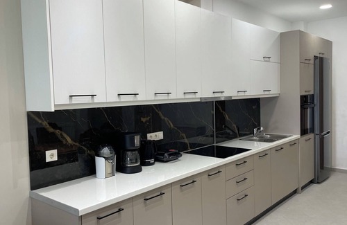 Downtown apartment often reflects the cosmopolitan ambiance of the surroundings. Modern and stylish decor, large windows that frame urban vistas, and well-designed spaces create a comfortable and inviting retreat. It has a large space with the living room, the dining table and the kitchen, a queen size bed bedroom, a 2 twin bed bedroom ,the bathroom and the balcony with a seating area for two. The apartment was fully renovated in the summer of 2023.
