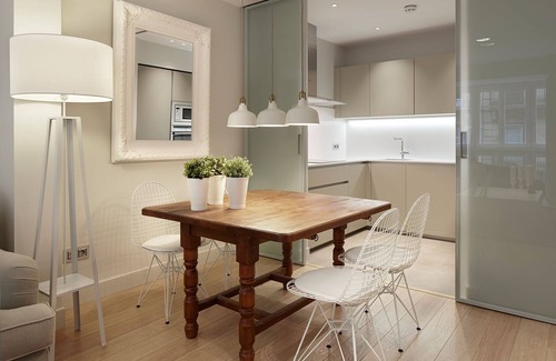 The main daytime area is a spacious and bright open plan lounge-dining room. In the lounge, there is a comfortable sofa-bed, a sober chaise-lounge next to a gorgeous closed balcony, a large coffee table and two modern puffs. There is also a flat screen TV set. In the dining area we find a rustic style table with chairs where you"ll be able to enjoy wonderful evenings during your holidays in San Sebastian. Next to the dining area and separated by glass sliding doors, we find the apartment"s kitchen. Thanks to these doors the kitchen area remains totally independent and free from smells and noises. It is a modern kitchen fully fitted with top of the range electric appliances and complete kitchenware.