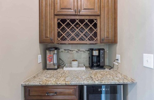 appliances, and a butler’s pantry. Enjoy your morning coffee at the fully stocked coffee bar