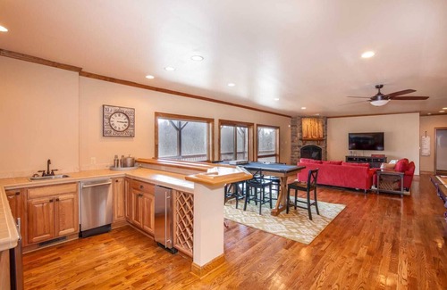 This home features numerous activities for all ages including a hot tub, multiple game tables, a full bar, and more. The kitchen is equipped with granite countertops, stainless appliances, and a gas cooktop. The dining room has dinner seating for 10 or more people with room and amenities in the home to entertain a large group. The lower level bar has a mini-fridge, a wine cooler, a sink, a dishwasher, an ice maker, and an oven.