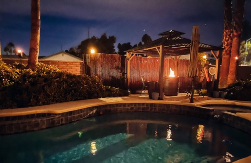 The outdoor area is our prized gem. Truly resort-style landscaping and entertaining. Optional heated pool, and spa, (additional charge to heat the pool and spa), gas fire pit, charcoal and gas bbq (both propane and charcoal are provided), multiple seating areas, a specific dog run behind the bbq, and a swing.