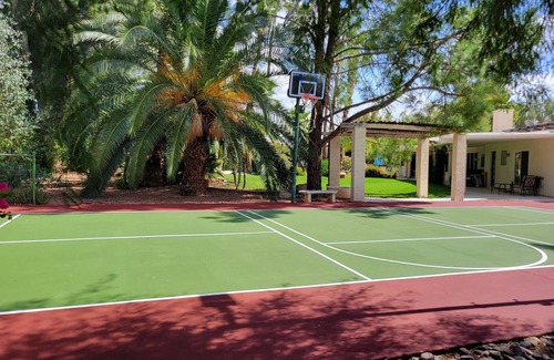Lush, green, private desert oasis on an acre lot, complete with a gas heated pool (heat available for an extra fee), a large hot tub (included), and a sport court. Guests can relax by the private, spacious, sparkling pool, enjoy shaded lounging areas, and take in the beautiful views of the McDowell Mountains. The lighted sport court, surrounded by mature trees, invites basketball or pickle-ball matches, with rackets, balls, and net provided. The property also features a barbecue and expansive outdoor patios, perfect for entertaining and dining.