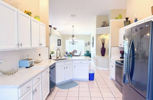 Please contact us for monthly specials (up to 3 months). Welcome to this amazing waterview property close to all theme parks. Our house sleeps up to 8 guests and is located about 10 miles only from Walt Disneyworld (about 15-17 min drive). Providence, Reunion and Champions Gate's famous golf courses are also a short drive (around 15 min). You will love the open floorplan. The first bedroom has a queen size bed and the second bedroom has 2 full beds. The third bedroom has two california twin beds. Those 3 bedrooms share a bathroom (bathtub). And the primary bedroom has a king and a private bathroom. The kitchen is fully equipped with pots and pans, dishware, microwave, dishwasher, fridge, stove and we also have a washer and dryer for your convenience. The dining table can sit up to 8 guests. You will love the view from the pool deck. And for the ones among you who do NOT like to swim or sit by the pool, we also have a games room with a pool table and air hockey. Do NOT waste this opportunity. The property is very popular and may be get booked soon. Memories guaranteed. **NOT included in our rental prices : Pool heating** Only the guests who have been registered are allowed to stay in the property. *** Pool heaters are set to 86 prior to your arrival. The reached temperature will depend on the weather. Pool heaters run 12 hours during the day. No refund or compensation will be given if the pool heater does not work unless the guests paid for the heating of the pool and it is proven that there was a technical issue that created an inconvenience. The refund or compensation will never exceed the amount paid by the guest for the heating of the pool.