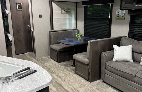 Discover this adorable camping gem in the Laurel Highlands. Nestled in a peaceful private lot this cozy camper retreat features a comfortable queen bed, WiFi, heating, and AC. With two additional living spaces offering a bunk bed and a sofa bed with a folding table as a full bed, this enchanting property is perfect for guests looking to unwind and relax. A great place to call homebase while you're away, we hope you enjoy your stay.