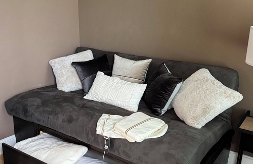 A sophisticated retreat designed for the discerning traveler. This meticulously curated space offers a tranquil environment, distinguished by high-end furnishings from RH. From the bespoke entryway lighting to the elegant wallpaper, creating an atmosphere of refined taste. A custom loft provides a versatile area for entertaining, accommodating guests, or private workspace. This is ideally suited for long-term stays, particularly for traveling professionals seeking an elevated living experience. We look forward to welcoming you to our place.