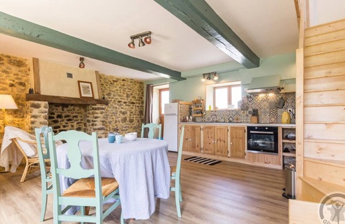 House adjoining the owner's house. Living room with fireplace (Internet with fiber) with equipped kitchen open to living room (oven, dishwasher, refrigerator with freezer, washing machine). On the 1st floor: bedroom 1 (1 bed 140X190), bedroom 2 (1 bed 140X190), shower room with toilet. Baby equipment on request. Internet. Electric heating at an additional cost. Sheets and towels for hire. Cleaning service at an additional cost. Shared unfenced land. Garden furniture. Barbecue. Parking. At the top of this hill, Nataly's property overlooks the bocage and offers a 360° panorama of the green countryside! She has taken up residence there and takes great pleasure in welcoming her guests in the 2 guest rooms or her small family gîte set up as an extension of her house. She shares the garden and her vegetable garden that she has set up on this promontory at the gateway to Brittany. The deliberately simple gîte is welcoming; intelligently equipped with materials or furniture recovered here and there. The staircase, quite steep, gives access to a very bright floor where the clearance on the landing even offers a relaxation area. All the richness of the place passes into the moments of exchanges and the preserved environment of this hill at the crossroads of 3 regions!
