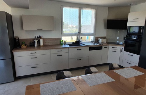 1 bathroom with a large walk-in shower and double sink. Separate toilet. Two bedrooms with a 140 x 200 cm bed and two bedrooms with a 140 x 200 cm bed and a 90 x 200 cm bed on the mezzanine. A large walk-in closet is shared by all four bedrooms (board games available). On the ground floor, a bathroom with toilet. Laundry area with washing machine and dryer, with games on site (badminton net and racket, Molky, adult and child pétanque set, wooden shuffleboard, beach racket).