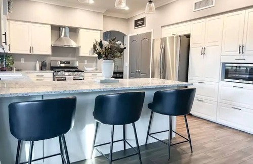 So much room for activities! You’ll find them all at this magazine-worthy 5BD/3BA home w/ office, heated pool & spa, well-equipped chef's kitchen & gigabit Wi-Fi. Kid & dog friendly; sleeps up to 12. 4 TVs w/ free streaming, fireplace, fire pit, BBQ, 6’x3’ table tennis, PAC-MAN, giant Jenga, cornhole & tons of games. In a quiet neighborhood w/ parks & playgrounds & near Gilbert Heritage restaurants & farmer's market, your oasis for family fun, memorable meals, celebration & relaxation awaits.