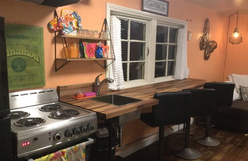 This Come & Go Cottage offers A gentle mix of its 1890s vintage essence along with all the modern amenities & gadgets! Guests love the vintage windows that Serv as a “pass-through” from the breakfast bar indoors to the bar top outdoors! (Sometimes you just want that fresh air and be part of what’s going on in the courtyard while you’re inside!)