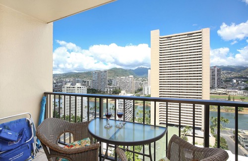 Located on the cool side of the building, you'll enjoy lovely Ala Wai Canal and Ko'olau Mountain views from this well-equipped 23rd floor one-bedroom condo (553 sqft plus lanai with table and chairs), in one of Waikiki's most sought after condominiums, Four Paddle! City lights sparkle at night! 4-person max.