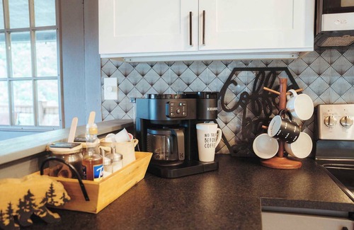 Fully equipped spacious kitchen with coffee station, Keurig & drip coffee maker, blender, crockpot, toaster, spices, and pantry staples. Step outside to grill or enjoy meals on the sunny deck.