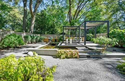 Zen garden with illuminated fountains, fish pond, and private hot tub.
