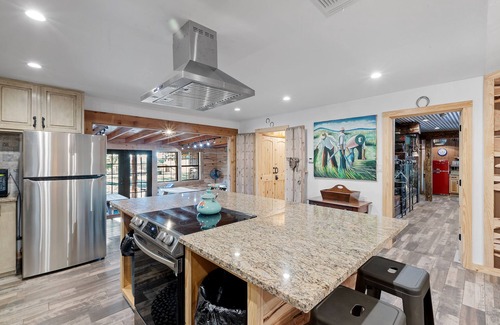 Beautifully situated atop the Bluff of the Guadalupe River. This extraordinary country house has been newly remodeled and equipped with everything you need for a dream vacation. There is an outstanding view from the house, yard, and a hot tub of the Guadalupe River. Features an adult tree house with built-in seating and bar. The kitchen is well-equipped to do your own cooking and there is more than adequate dining space for everyone to sit together. The bunk room is unlike any other rental in the hill country!