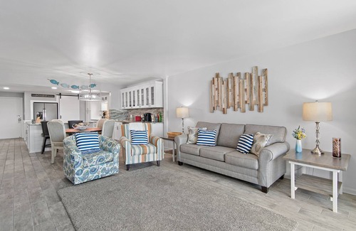 Welcome to the newly renovated Shoreline Towers 3033, a spacious beachfront retreat offering two bedrooms, two full bathrooms, and accommodations for up to six guests, as permitted by the HOA. Step into a beautifully updated kitchen featuring granite countertops, stainless steel appliances, and all the essentials for a comfortable stay. Enjoy meals at the generous breakfast bar or gather in the adjacent dining area. Just off the kitchen, a convenient wet bar includes a sink, wine cooler, and ice maker — perfect for entertaining. Soak in the vibrant coastal colors and serene Gulf views from your private balcony, an ideal spot to unwind any time of day. When evening falls, the inviting living room offers a cozy place to relax, complete with a queen sleeper sofa for added flexibility. The spacious primary suite boasts a king bed, stunning Gulf views, and direct access to the balcony. The guest bedroom features two queen beds, providing plenty of space for family or friends.