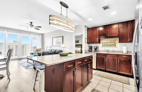 Step into laid-back luxury at Laketown Wharf 906, a beautifully appointed condo designed for unforgettable beach getaways. Perfectly positioned in the vibrant heart of Panama City Beach, this spacious 2-bedroom retreat (plus a cozy bunk nook) comfortably accommodates up to 8 guests. Start your mornings with serene lake views from your private balcony and end your evenings watching the sky turn shades of orange and pink. The condo features two king bedrooms for ultimate comfort, a tucked-away twin-over-twin bunk for the kids, and a queen sleeper sofa for additional guests. Inside, you’ll find an open-concept living space made for relaxing, with a smart TV and all the comforts of home. Whether you're cooking up a quick meal, lounging after a day in the sun, or enjoying a movie night, this space is designed for easy living. From the beach just steps away to resort-style amenities and nearby attractions, Laketown Wharf 906 offers the perfect blend of relaxation and excitement. Come stay, unwind, and make memories that’ll bring you back again and again.