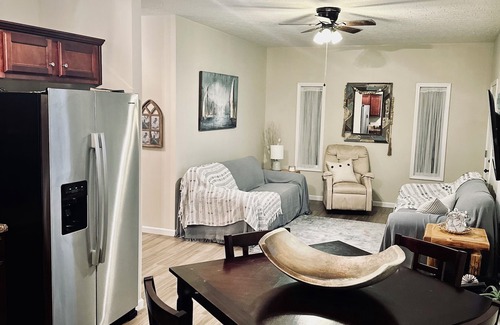 Newly built 2 bedroom 2 bath cottage located minutes from Jamestown Marina and picturesque Lake Cumberland. Beautiful scenic views during the day, then at night a fantastic illuminated wooded area surround a one of a kind outdoor living space boasting upper and lower level fire pits. Whether you prefer to grill out or cook in the fully equipped kitchen you will love the screened in porch to enjoy your meals. Plenty of outdoor space for parking your vehicles and boat. The cottage comfortably sleeps 8, and has smart TVs in the common area and both bedrooms. The area has many beautiful sites besides the lake, Fish hatchery, Mills springs Battlefield & Museum , Wayne County Historical Museum and much more. Also many places to eat out if you prefer not to cook while on vacation! So whether you are looking for a relaxing or exciting vacation Harbor Hideaway will accommodate your needs!