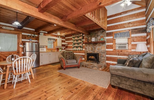 'HEARTS BURSTING WITH LOVE' is a 'Hand Hewn' log cabin located in the foothills of the Great Smoky Mountains National Park in Cosby, TN. The cabin is rustic in atmosphere with exposed beam ceilings throughout. It has most of the comforts and modern conveniences of home, maybe more. This cabin features a kitchen, dining area, living room and bathroom downstairs and a bedroom with a queen bed upstairs. A daybed (upstairs in the bedroom) provides additional sleeping .